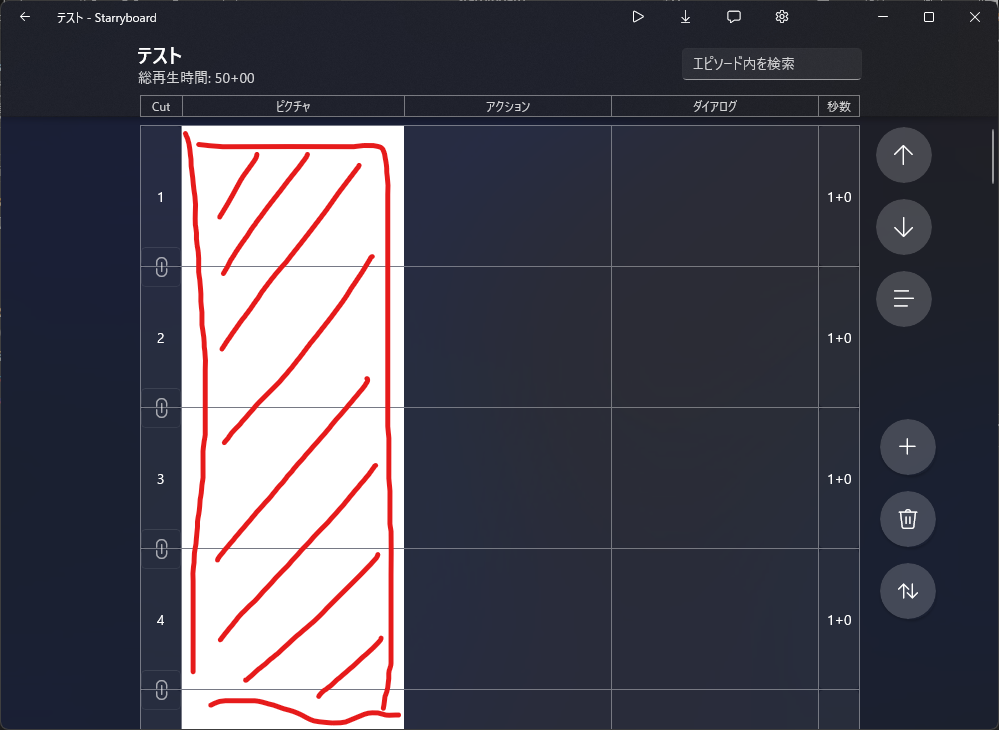 エピソードを作成するとカットが一覧表示された「リストページ」が表示されます。リストページは編集ではなくセリフ等テキスト編集と確認をメインに行うページです。