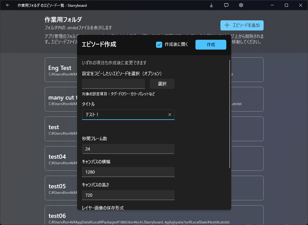 Starryboardではエピソードを1つのファイルとして管理しており、ファイル中には全てのカット、カット内の画像、キャンバス設定、カメラ・レイヤーのモーション(動き、アニメーション)、エクスポート方法などが記録されます。